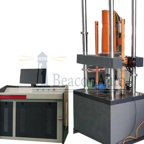 鐵路墊板動態試驗機 軌道墊板疲勞 軌枕 橡膠節點 鐵路墊板用于鋼軌和混凝土軌枕之間,它的主要作用是緩沖車輛通過路軌時所產生的高速振動和沖擊,保護路基和軌枕,并對信號系統進行電絕緣.鐵路墊板動態試驗機 軌道墊板疲勞 軌枕 橡膠節點試驗機廣泛應用于材料和零部件的動、靜態力學性能試驗,包括材料和零部件的拉伸、壓縮、低周和高周疲勞等試驗。本試驗機可以滿足TB/T3396.1-2015《高速鐵路扣件》中要求的附錄A、B、C所規范的各種實驗方法。 結構特征與工作原理:該機由主機、泵站、冷水機以及控制系統等幾部分組成。主機由底座、立柱、移動橫梁、作動器、抱緊缸以及升降油缸組成。四立柱安裝在工作臺上面。移動橫梁貫穿在四立柱上,橫梁貫穿孔外側開有鎖緊口,正面安裝有鎖緊油缸。兩升降油缸固定在移動橫梁上面對角穿過中線,活塞桿向下伸出反向托舉橫梁移動,橫梁通過升降油缸可沿立柱上下移動,完成空間調整。作動器安裝在移動橫梁上面中心位置,活塞桿自橫梁中心孔向下伸出,并與試驗上輔具連接。負荷傳感器安裝在活塞桿上面和作動器中心位置對中,下面工作臺部分為放置輔具和測量變形的傳感器。 鐵路墊板動態試驗機 軌道墊板疲勞 軌枕 橡膠節點技術規格: 1、大靜態試驗力:±250kN,靜態示值精度:全程不分檔 ±0.5%; 2、大動態試驗力:±250kN;動態波動度:不大于±1%。 3、作動器大振幅:±75mm,示值精度±0.5%。 4、頻率范圍:0.01—50Hz ,長時工作頻率0.01~50Hz。 5、位移測量精度:±0.5%示值 (全程不分檔) 6、位移測量分辨率(磁致伸縮位移傳感器):0.01mm 7、軌道墊板疲勞試驗機由主機、泵站、冷水機以及控制系統等幾部分組成。主機由底座、立柱、移動橫梁、作動器、抱緊缸以及升降油缸組成。四立柱安裝在工作臺上面。移動橫梁貫穿在四立柱上,橫梁貫穿孔外側開有鎖緊口,正面安裝有鎖緊油缸。兩升降油缸固定在移動橫梁上面對角穿過中線,活塞桿向下伸出反向托舉橫梁移動,橫梁通過升降油缸可沿立柱上下移動,完成空間調整。作動器安裝在移動橫梁上面中心位置,活塞桿自橫梁中心孔向下伸出,并與試驗上輔具連接。負荷傳感器安裝在活塞桿上面和作動器中心位置對中,下面工作臺部分為放置輔具和測量變形的傳感器。 標簽:鐵路墊板動態試驗機 軌道墊板疲勞 軌枕 橡膠節點