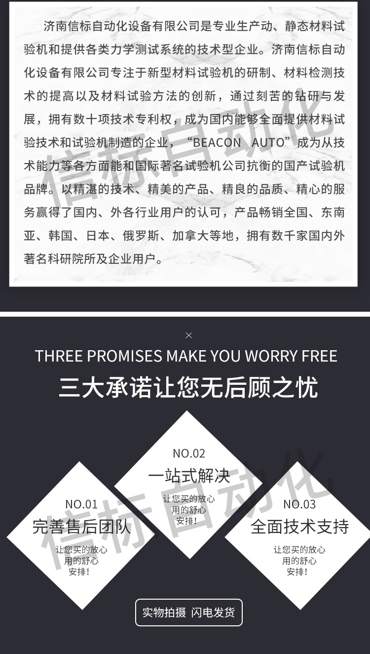 濟南信標自動化設備有限公司主要生產:動靜態萬能疲勞試驗機,接骨板彎曲試驗機,縫合線拉伸疲勞試驗機,髖膝關節磨損試驗機,電子萬能試驗機、液壓萬能試驗機、巖石三軸、四軸,電液拉力試驗機,材料試驗機,高低溫蠕變,高低頻疲勞,拉伸、扭轉、杯突等二十多個系列兩千多個的品種。