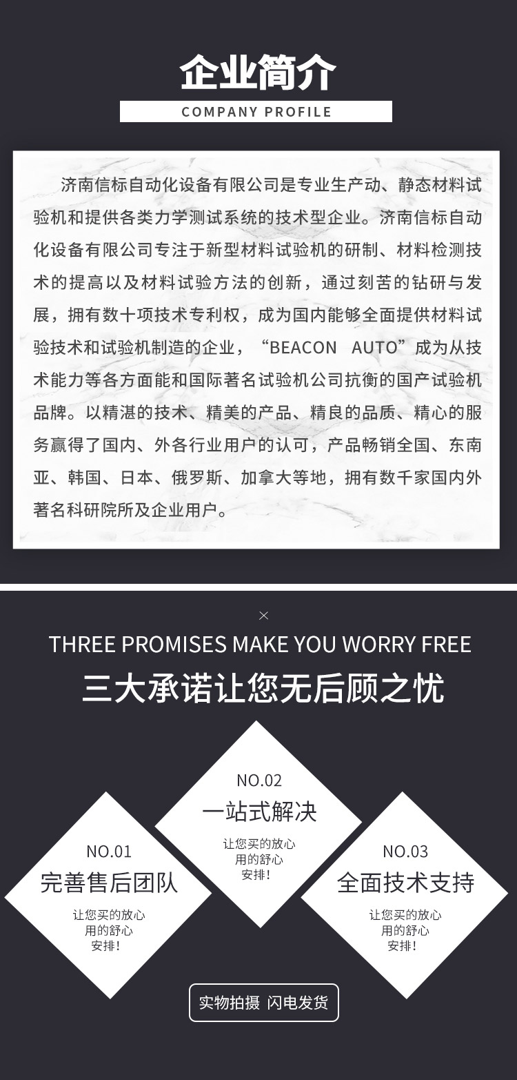 濟(jì)南信標(biāo)自動化設(shè)備有限公司主要生產(chǎn):動靜態(tài)萬能疲勞試驗(yàn)機(jī),接骨板彎曲試驗(yàn)機(jī),縫合線拉伸疲勞試驗(yàn)機(jī),髖膝關(guān)節(jié)磨損試驗(yàn)機(jī),電子萬能試驗(yàn)機(jī)、液壓萬能試驗(yàn)機(jī)、巖石三軸、四軸,電液拉力試驗(yàn)機(jī),材料試驗(yàn)機(jī),高低溫蠕變,高低頻疲勞,拉伸、扭轉(zhuǎn)、杯突等二十多個系列兩千多個的品種。