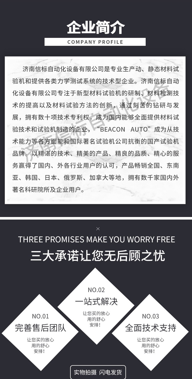 濟南信標自動化設備有限公司主要生產:動靜態萬能疲勞試驗機,接骨板彎曲試驗機,縫合線拉伸疲勞試驗機,髖膝關節磨損試驗機,電子萬能試驗機、液壓萬能試驗機、巖石三軸、四軸,電液拉力試驗機,材料試驗機,高低溫蠕變,高低頻疲勞,拉伸、扭轉、杯突等二十多個系列兩千多個的品種。