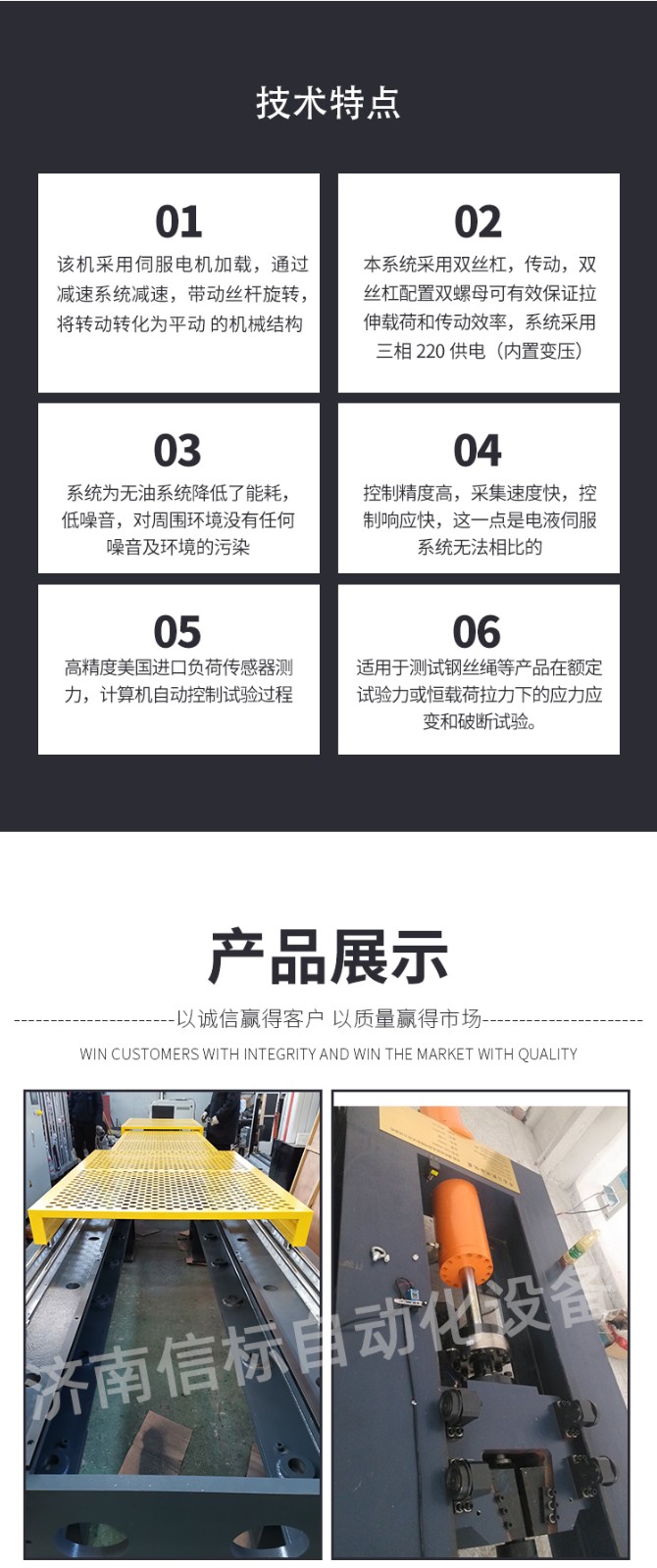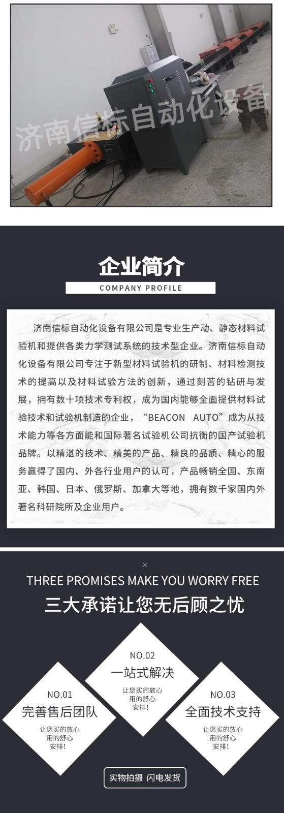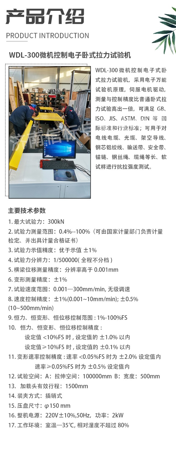 試驗標準: GB/T 8358-2014 鋼絲繩實際破斷拉力測定方法 GB∕T 1179-2008    圓線同心絞架空導線 DL/T 832-2003   光纖復合架空地線 DL/T 788-2001   全介質自承式光纜 GB/T 7424.4-2003 光纜 第4部分:分規范 光纖復合架空地線 IEC 60794.4-2009 光纜 第4部分:分規范 輸電線架空光纜 IEEE 1138-2009    電力事業用電線的復合光纖架空地線的建造標準  GB/T16491-2008    電子式萬能試驗機  GB/T228.1-2010    金屬材料室溫拉伸試驗 GB/T4909.3-2009   裸電線試驗方法 第3部分:拉力試驗 GB/T14049-2008    額定電壓10KV架空絕緣電纜 GB/T12527-2008    額定電壓1KV及以下架空絕緣電纜 GB/T3955-2009     電工圓鋁線 GB/T17048-2009    架空絞線用鋁線 GB/T17939-2009    電工用鋁包鋼線 GB/T3428/2012      架空絞線用鍍鋅鋼線 三、主要技術指標: 1. 最大試驗力:300kN  2. 試驗力測量范圍:0.4%--100%  (可由國家計量部門負責計量檢定、并出具計量合格證書) 3. 試驗力示值精度:優于示值±1% 4. 試驗力分辨力:1/500000(全程不分檔) 5. 橫梁位移測量精度:分辨率高于0.001mm 6. 變形測量精度:±1% 7. 試驗速度范圍:0.001—300mm/min,無級調速  8. 速度控制精度:±1%(0.001~10mm/min); ±0.5%(10~500mm/min) 9. 恒力、恒變形、恒位移控制范圍: 1%-100%FS 10.恒力、恒變形、恒位移控制精度:                設定值<10%FS時,設定值的±1.0%以內              設定值≥10%FS時,設定值的±0.1%以內 11. 變形速率控制精度: 速率<0.05%FS時為±2.0%設定值內                      速率≥0.05%FS時為±0.5%設定值內 12. 試驗空間: A:拉伸空間:100000mm  B:寬度:500mm 13.加載頭有效行程:1500mm 14. 裝夾方式:插銷式 15. 壓盤尺寸:φ150 mm 16. 整機電源:220V±10%,50Hz,功率:2kW 17. 工作環境:室溫—35℃,相對濕度不超過80%